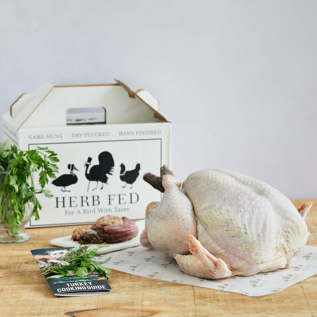 Herb Fed thanksgiving bronze turkeys arrive frozen and individually boxed with vacuum packed giblets (included in weight), a packet of fresh herbs, cooking instructions and a recipe for the ‘Perfect Christmas stuffing’.