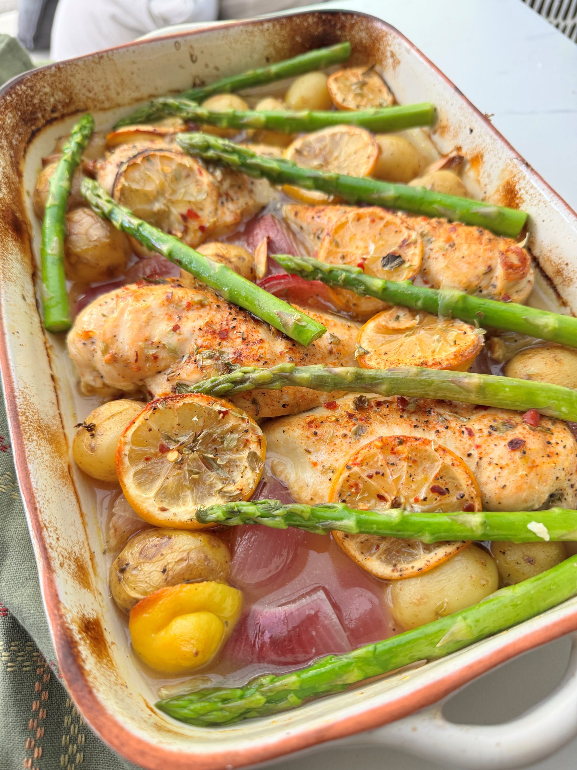 After the 40minutes cooking time add the asparagus to the dish, pushing it down into the juices and pop the dish back into the oven for a further 5 minutes.