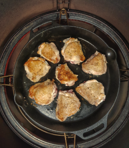 Sear the chicken thighs in the oil in a hot pan then remove
